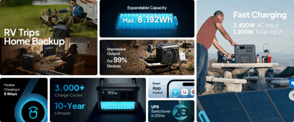 | Allpowers | Models from 299Wh to 3600Wh+, fast charging (<2h), solar input up to 1000W | LiFePO4 batteries, MPPT solar integration | Tiny houses, modular homes, camping | €169 – €1799 depending on capacity (R600 ~€169, R1500 ~€459–599, R4000 ~€1799) |